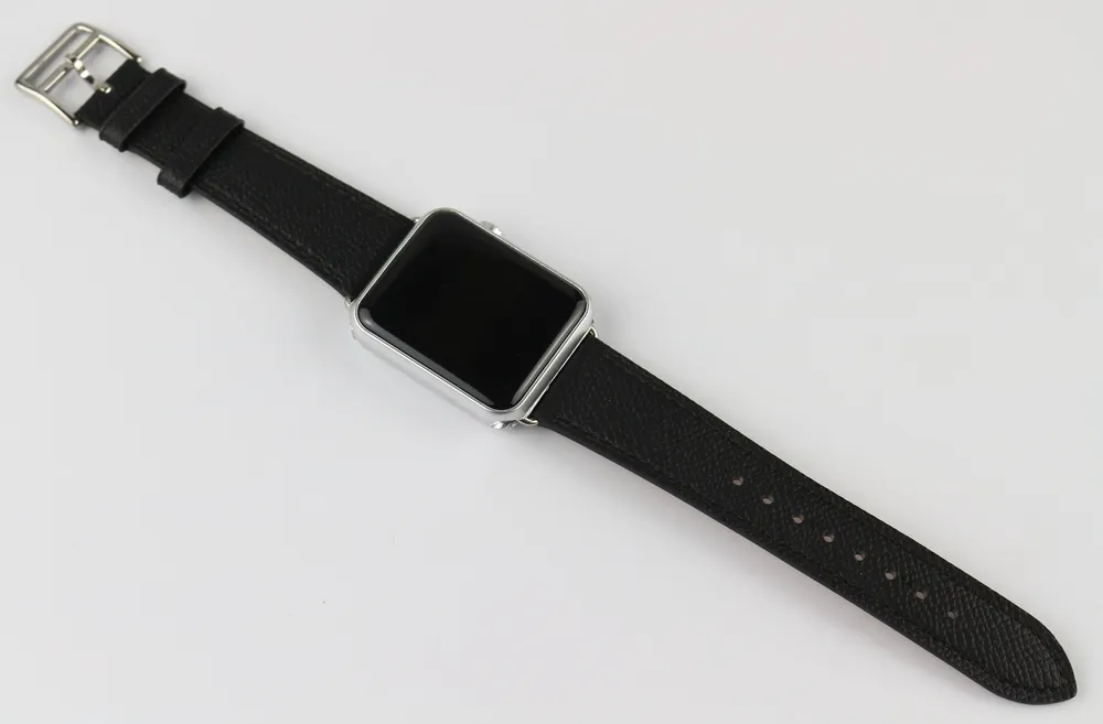 The hand-painted edges of this Black Epsom Leather Apple Watch Strap/Band contribute to a smooth feel and a formal look, making it an ideal accessory for various occasions. Elevate your style with a strap that combines timeless elegance with lasting quality.